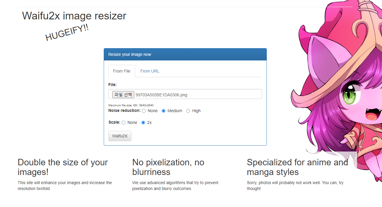 2. 파일선택을 눌러 저화질 사진을 선택하여 하단의 "Waifu2X"를 클릭!