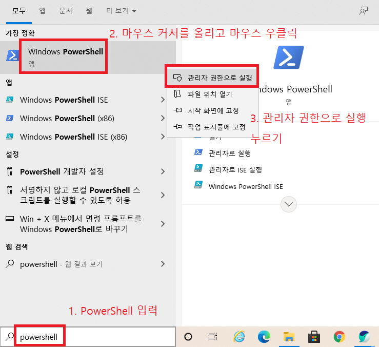 2) 검색창에 PowerShell을 입력하여 메뉴창을 불러옵니다. Windows PoewerShell을 마우스 오른쪽 버튼으로 누르고 "관리자 권한으로 실행"을 눌러 PowerShell을 관리자 모드로 여세요
