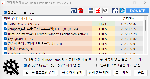 저는 깔끔하게 없애버리기 위해 "목록에 없는 숨은 구라도 제거" 옵션도 체크를 해서 없앴습니다.