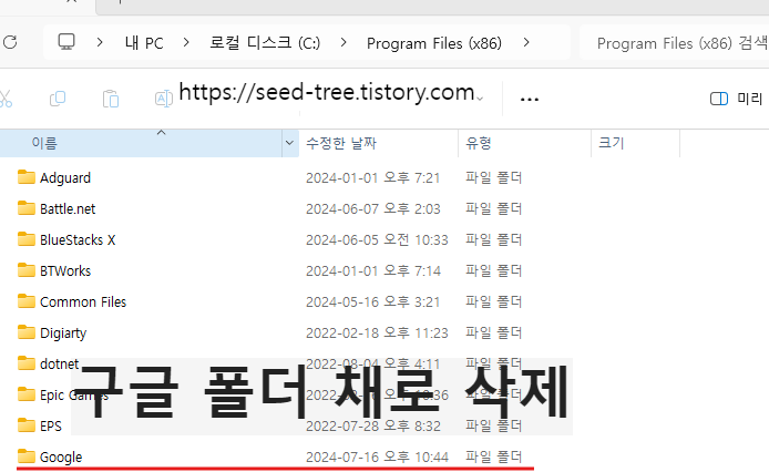 2. 내컴퓨터 > C드라이브 > Program Files (x86) > Google 폴더를 삭제해 주세요