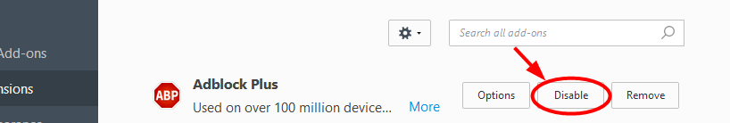 ii. Firefox에서 Disable 버튼을 클릭하여 광고 차단 확장을 비활성화하십시오.