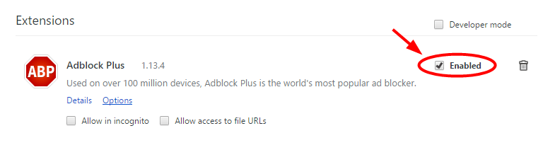 i. Google Chrome에서 광고 차단 확장 옆에 있는 Enabled 확인란을 선택 취소하여 비활성화하십시오.