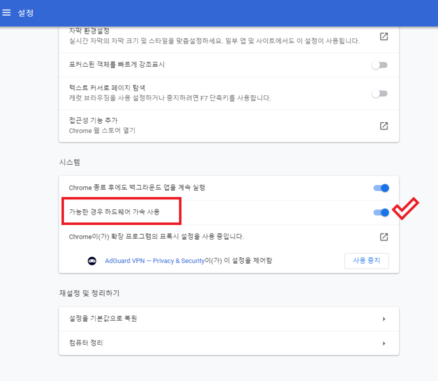 4) 시스템에서 사용 가능한 경우 하드웨어 가속 사용을 비활성 시켜준다. (파란색 막대가 회색으로 되어야 한다.)
